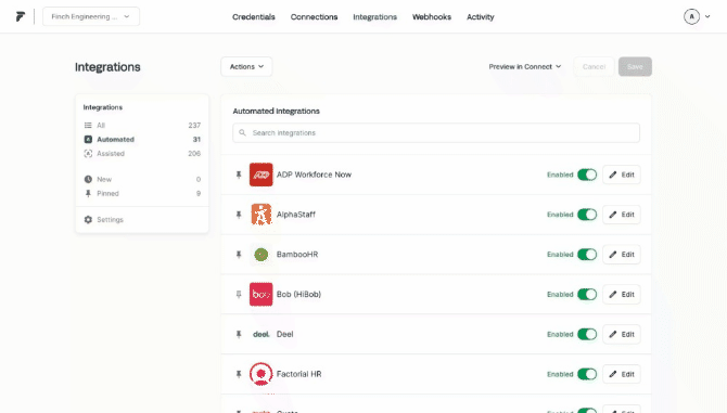 The Integrations tab of the Dashboard is where you can manage the providers that are available to your customers in Finch Connect. You can enable or disable providers, customize the order in which providers are displayed, and preview changes in Finch Connect.Verify Products, Field Support, and Authentication Methods for Providers