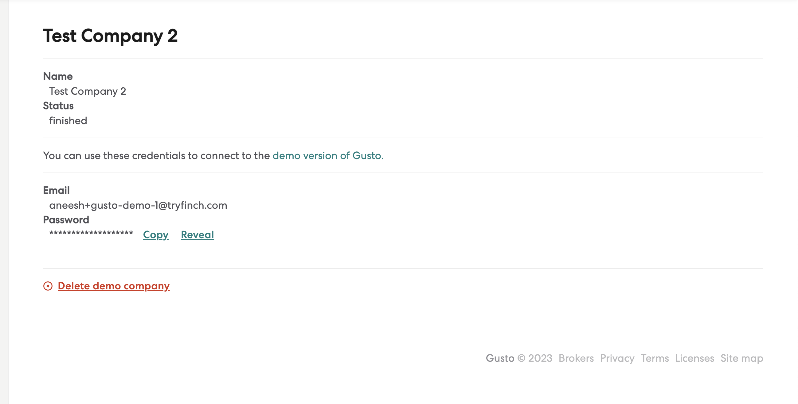 - To connect to this company via Finch, follow the steps outlined above to configure Finch Connect to display provider sandboxes, select Gusto, and input the credentials into Gusto’s OAuth flow. Upon successfull completion of Connect, you will have a working Gusto sandbox connection!